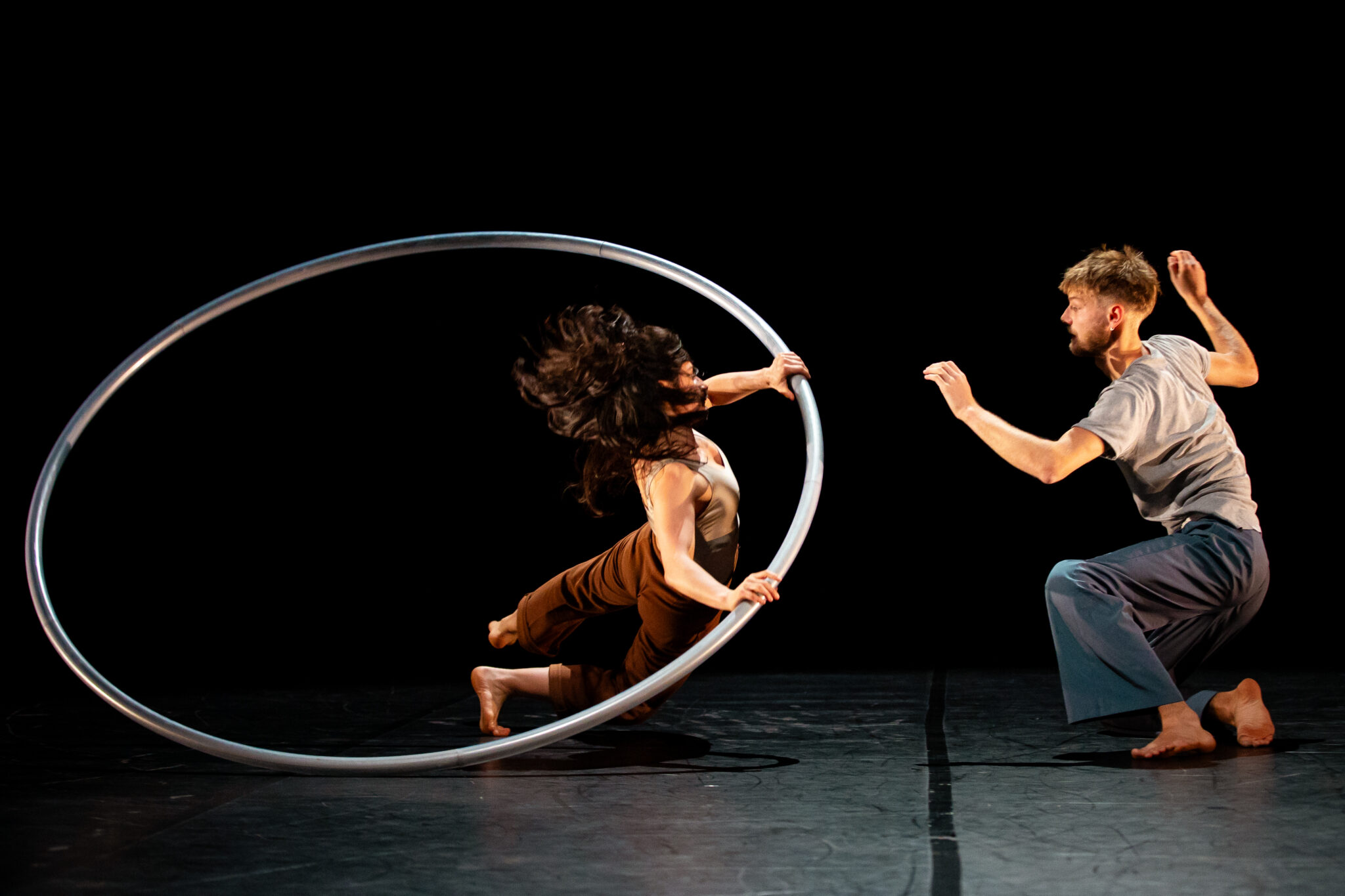 Jef et Marica se retrouvent contraints dans leur différence, leur façon de penser et de voir le monde. Leur binôme semble ne pas pouvoir trouver de point de rencontre. Trop différents pour s’aligner, trop liés pour s’ignorer. Au centre de ce duo, une roue de fer, à la fois ligne de fracture et point de rencontre. Elle est le lieu d’échange, de transformation. À travers elle, ils apprennent à communiquer, tombent ensemble, se relèvent pour recommencer. Leurs corps cherchent un langage sans grammaire donnant vie à un dialogue physique intense, à la fois métaphorique et abstrait, où la rencontre entre les différences devient leur moteur créatif. Qu’est-ce qu’être deux sans se fondre ? Peut-on coexister sans compromis, sans fusion, sans hiérarchie ? In Difference n’offre pas de réponse. Elle la performe.